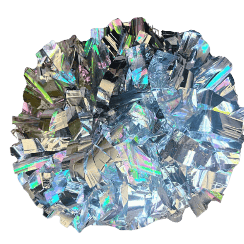 Because Laser is a premium and more expensive material, we guide teams toward designs that deliver major shine at a friendly price. Pom Express offers Laser as both a Flash or a Glitter add-in to any pom. We uniquely offer Laser at the same charge as any other material or color choice, adding in Laser as a Flash or Glitter option costs the same as adding in Iridescent Metallic.