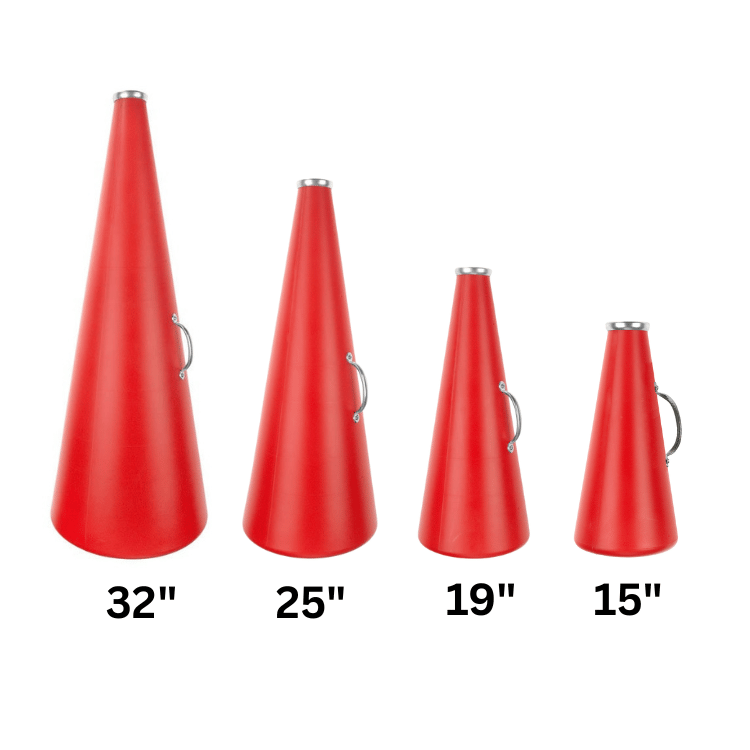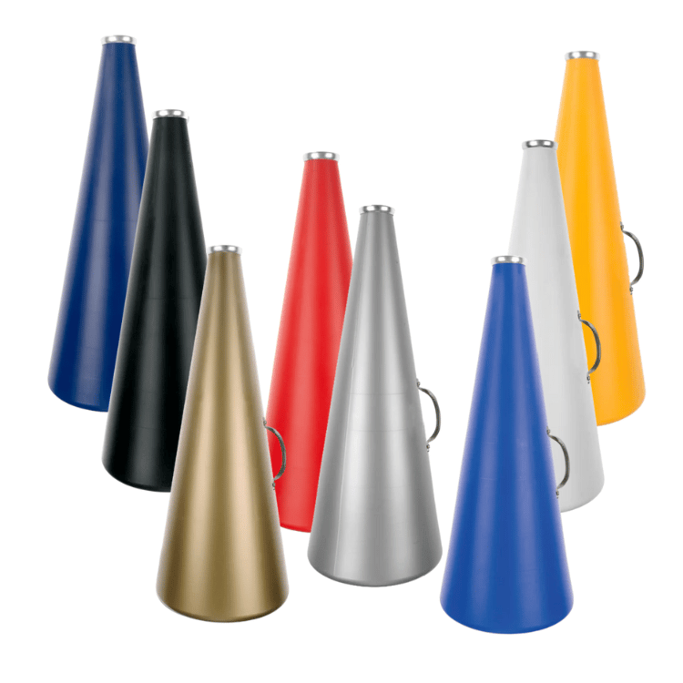 Made of bright, molded plastic in 8 great sports colors. Our megaphones feature a steel handle and aluminum mouthpiece.