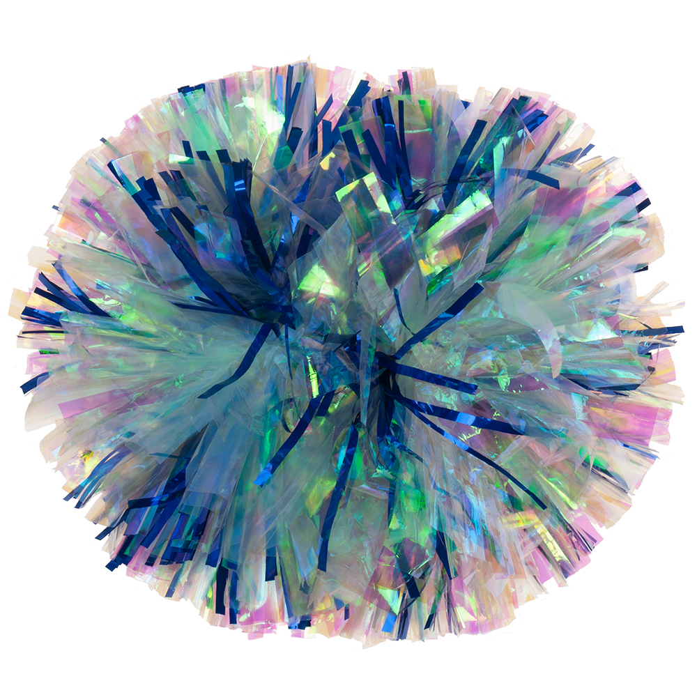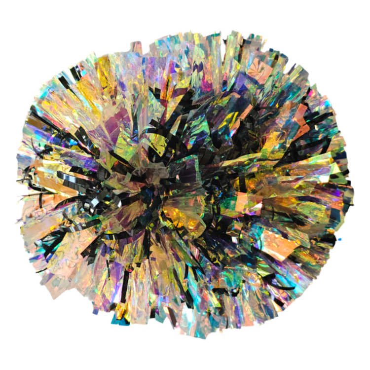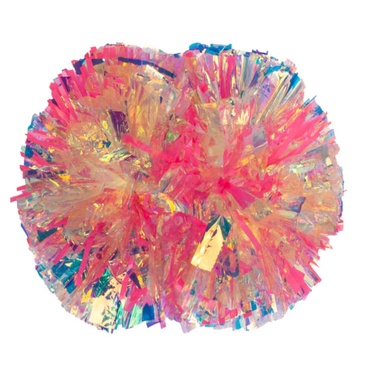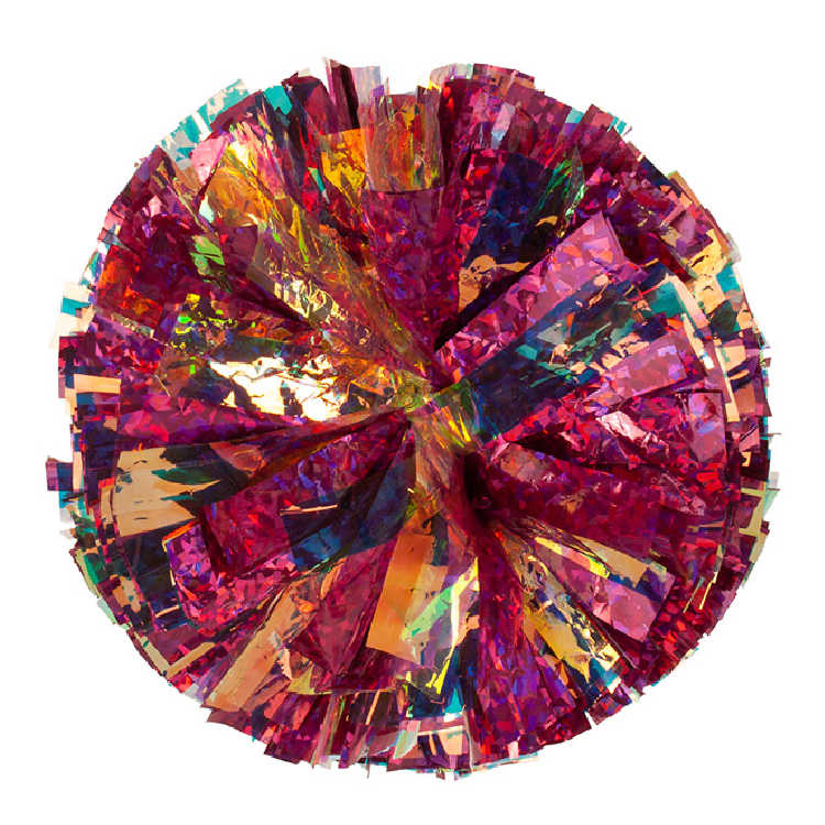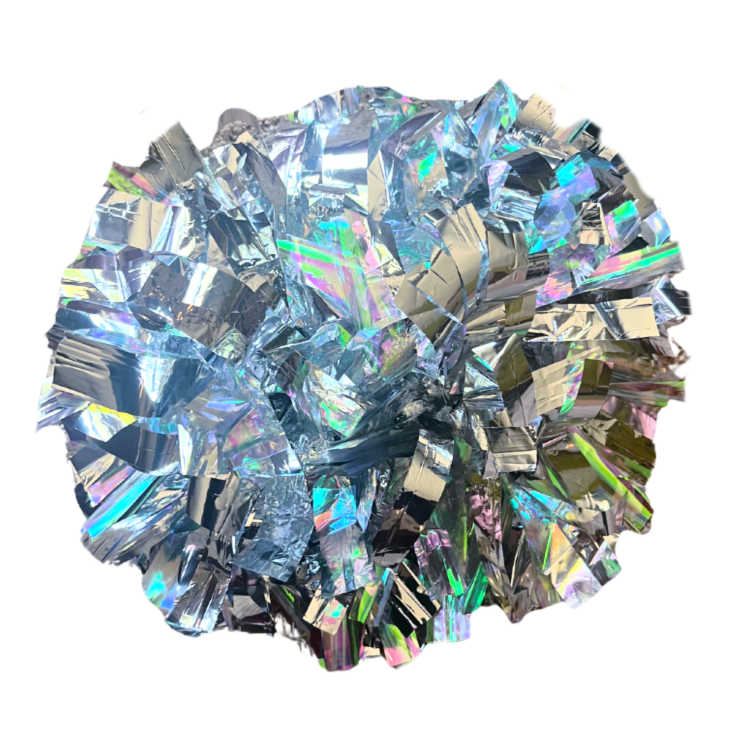 Iridescent reflects primarily pink and green tones, along with occasional blues, purples and golds depending on the light. It doesn't appear to change color like Laser does. It is an excellent option to add a light and airy feel to your pom or a pop of shine.