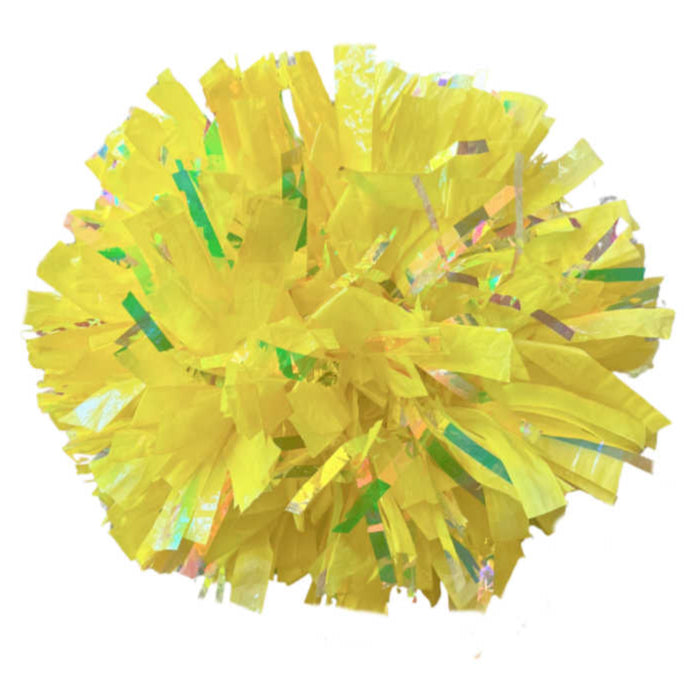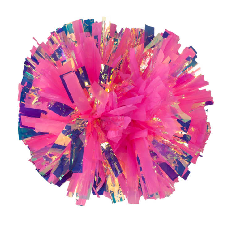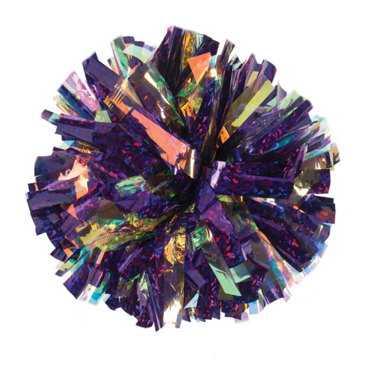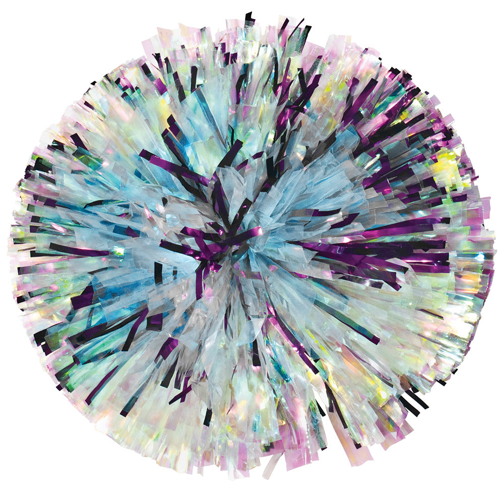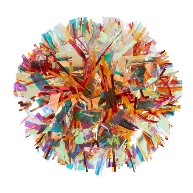 Iridescent reflects primarily pink and green tones, along with occasional blues, purples and golds depending on the light. It doesn't appear to change color like Laser does. It is an excellent option to add a light and airy feel to your pom or a pop of shine.